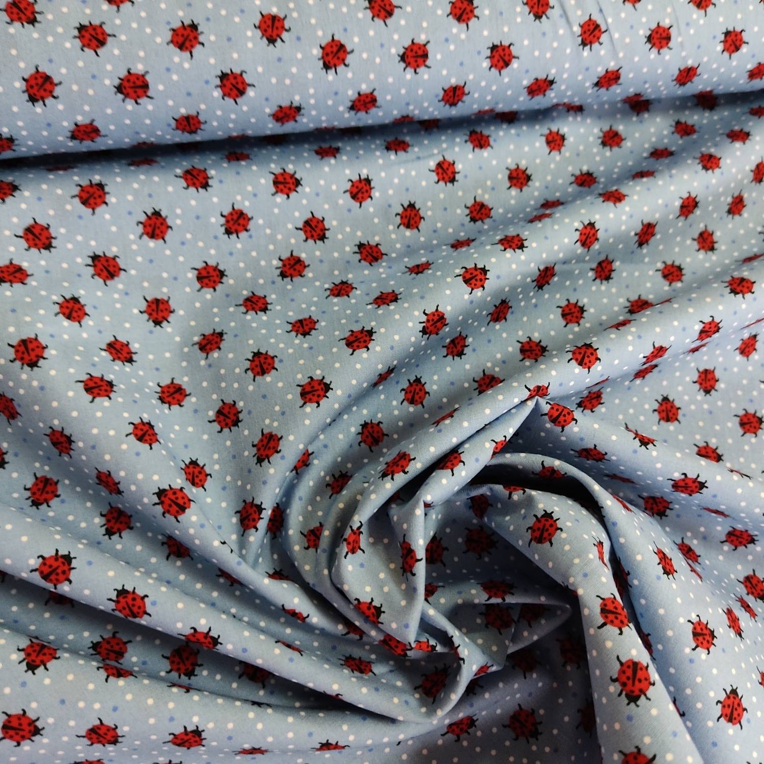 Tela 100% algodón. Tela de lunares con motivos de mariquitas.