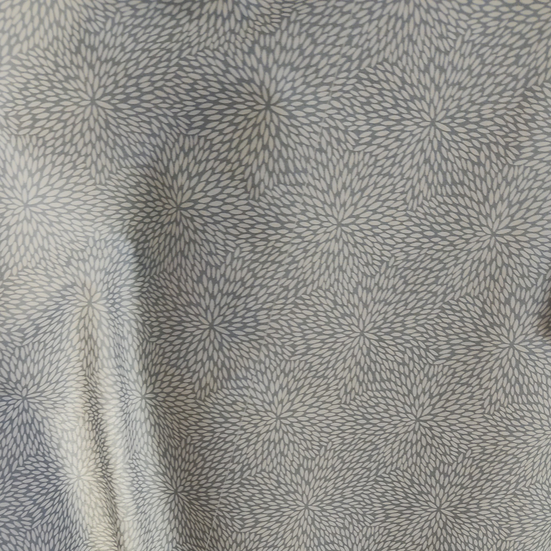 Viscosa 100%. Tela en blanco y gris con estampado abstracto.